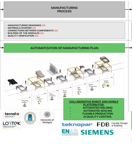 LORTEK will focus on developing a robotic welding system for metal profiles joining to substitute actual mechanical fastening used for metal profiles connection during curtain wall manufacture. This will facilitate disassembly for circularity and enable different design solutions. For that, an intelligent robotic welding process and an automatic weld inspection system in an industrially relevant environment will be developed and validated. To do so, various fusion welding processes (arc and laser welding) and robotic systems (industrial robots or collaborative robots) will be benchmarked to compare the process and robotic system performance, efficiency and scalability potential. In parallel, external sensors integration for process monitoring and control will be analysed and specifically developed for the selected robotic welding process/system. An automatic weld quality inspection system will be also developed.